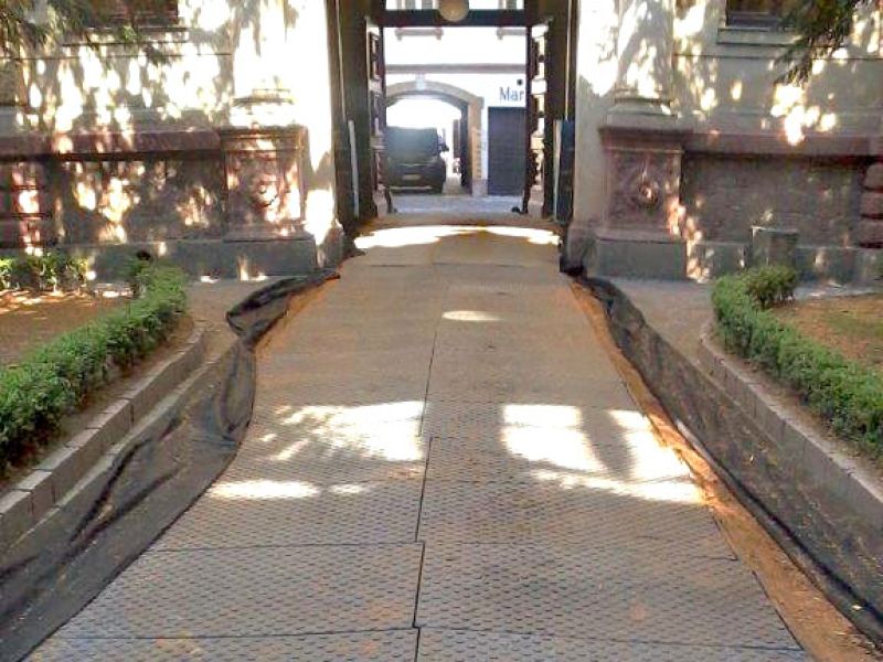 Dieses Kundenprojekt zeigt, wie die Bodenmatte FastFloor FF44 eingesetzt wurde, um empfindliche Oberflächen zu schützen. Das historische Mosaik im Eingangsbereich und das Kopfsteinpflaster im Hof sollten unversehrt bleiben, wenn dort Baumaschinen bewegt und Baumaterial gelagert wurde. Denn schon kleinste Kratzer oder Bodensetzungen können teure und aufwendige Reparaturen nach sich ziehen. Bei Gebäuderestaurierungen wirken häufig: